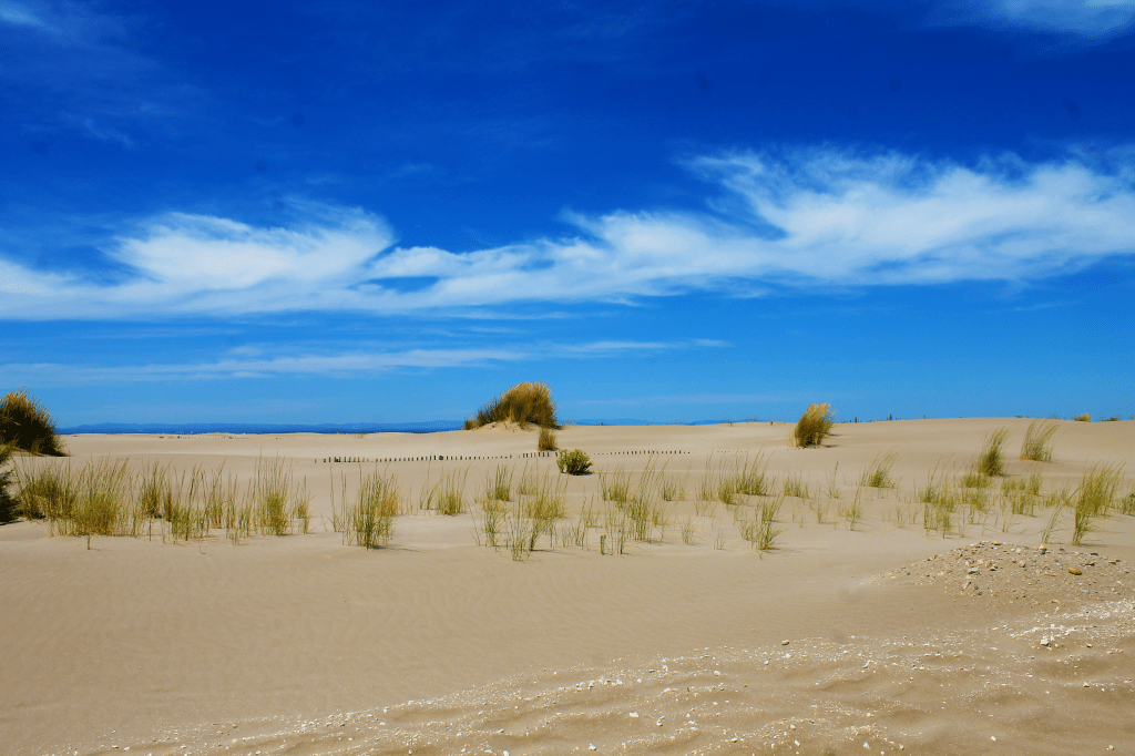 Arrivati a questo punto del viaggio e viste le temperature record decidiamo di dedicare un giorno al relax e scegliamo una delle spiagge più iconiche della zona: la Plage de l’Espiguette. Nascosta nel cuore della Camargue, è una delle spiagge più selvagge e incontaminate del Mediterraneo. Questa desertica distesa di sabbia fine e dorata, della lunghezza di oltre 10 km, tra dune mozzafiato e il mare blu cristallino, rappresenta una meta perfetta per chi cerca un ritiro naturale e ristoro dal caos e dal caldo estivo.